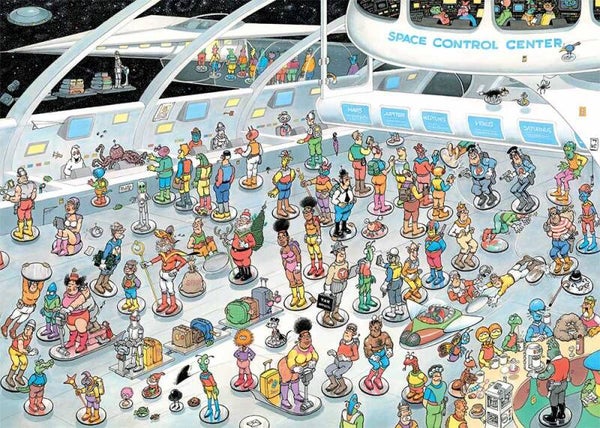 Stap in de tijdmachine en reis mee naar een wereld vol sterren en technologie: hoe zou een ruimtestation er in de toekomst uitzien? En in wat voor bizarre, futuristische wereld zal de Jan van Haasteren - familie straks ronddwalen?